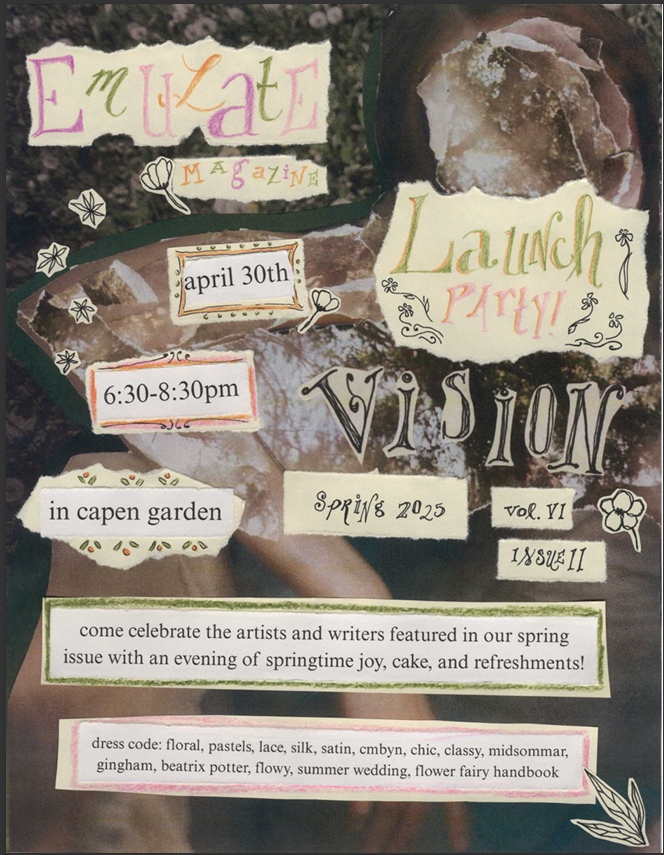 Emulate Magazine (Smith College) published the theme of VISION in their interdisciplinary art and literary magazine of Spring 2025. Work features artists connected to the Connecticut River Valley, consisting of Smith students, professors, and friends in the 5 Colleges.